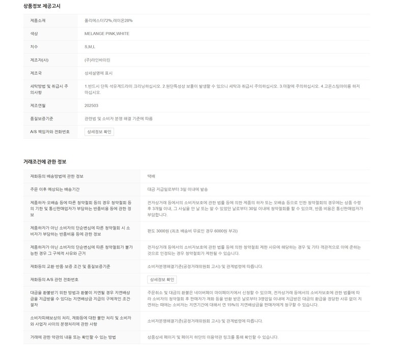 | 6. 세탁방법 및 취급시 주의사항 | 상품상세참조 |