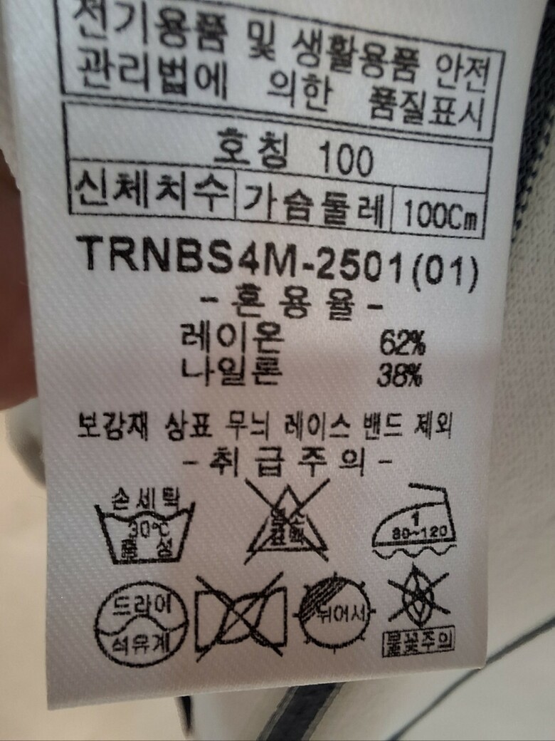 | 1. 제품 소재 (섬유의 조성 또는 혼용률을 백분율로 표시, 기능성인 경우 성적서 또는 허가서) | 레이온 62%, 나일론 38%, 니트 |