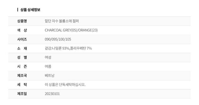 | 6. 세탁방법 및 취급시 주의사항 | 상품상세참조 |