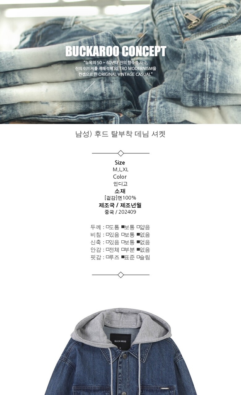 [버커루] 남성) 후드 탈부착 데님 셔켓 (B255DJ330P1)