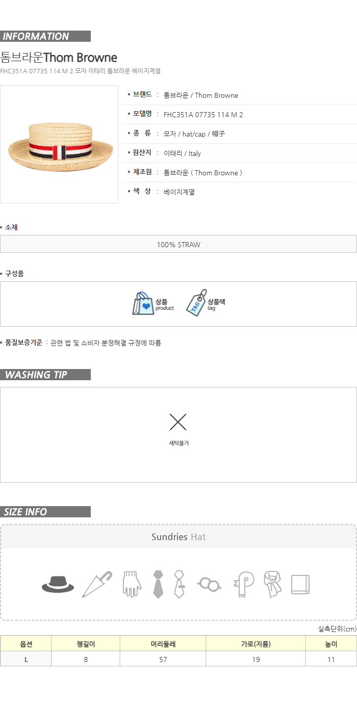 [명품] 톰브라운 삼선 내추럴 보터햇 공용 FHC351A