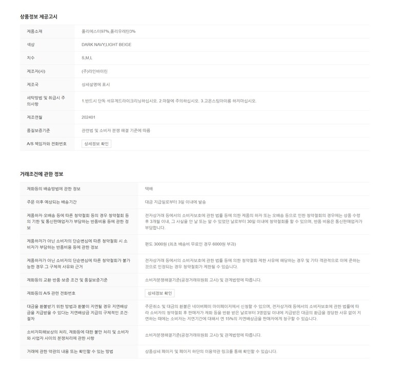 | 6. 세탁방법 및 취급시 주의사항 | 상품상세참조 |