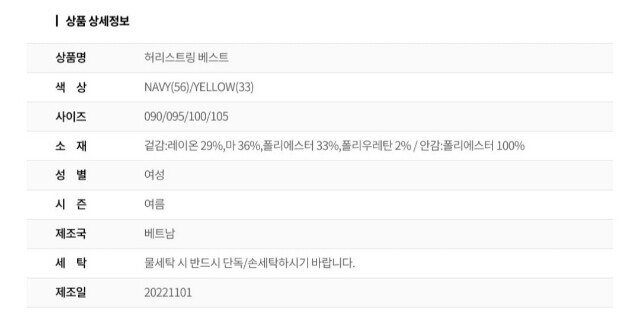 | 1. 제품 소재 (섬유의 조성 또는 혼용률을 백분율로 표시, 기능성인 경우 성적서 또는 허가서) | 상품상세참조 |