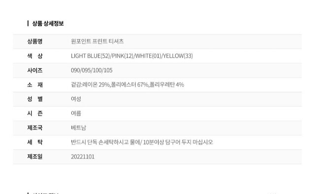 | 1. 제품 소재 (섬유의 조성 또는 혼용률을 백분율로 표시, 기능성인 경우 성적서 또는 허가서) | 상품상세참조 |