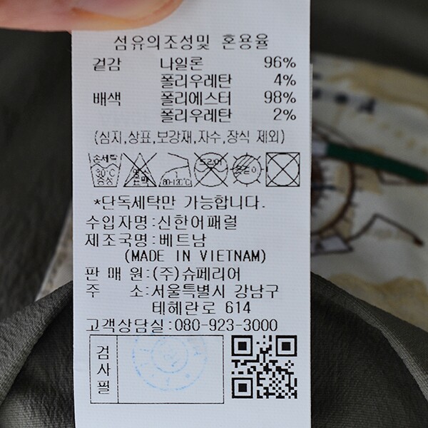 | 1. 제품 소재 (섬유의 조성 또는 혼용률을 백분율로 표시, 기능성인 경우 성적서 또는 허가서) | 나일론96%폴리우레탄4% |