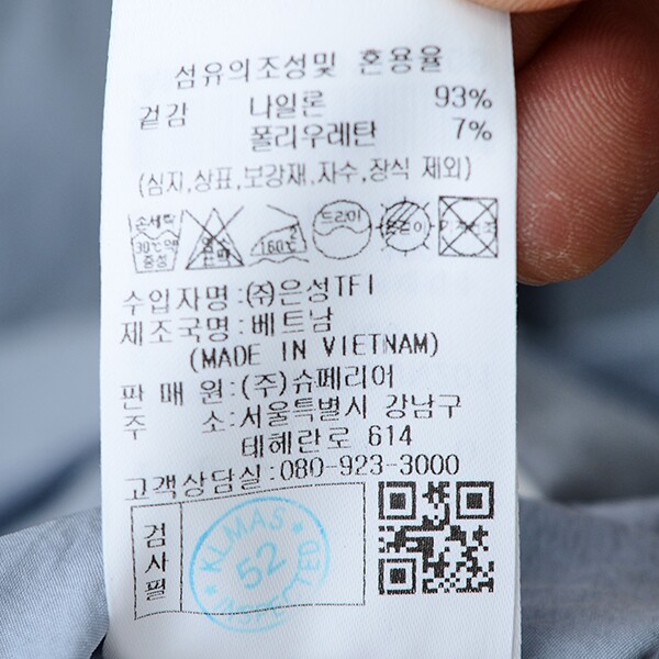 | 1. 제품 소재 (섬유의 조성 또는 혼용률을 백분율로 표시, 기능성인 경우 성적서 또는 허가서) | 나일론93%폴리우레탄7% |