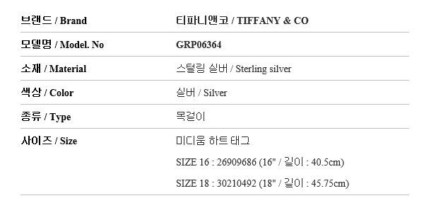 티파니앤코 목걸이 30210492 (GRP06364) 리턴 투 티파니 미디움 하트 태그 키 18in 실버 여성목걸이 당일발