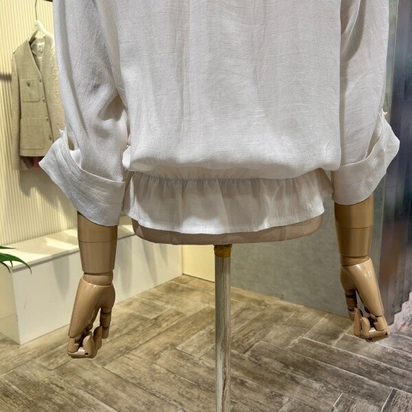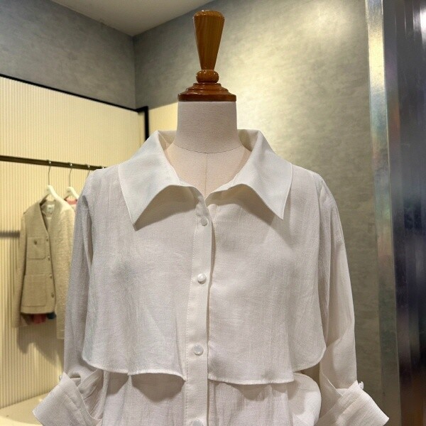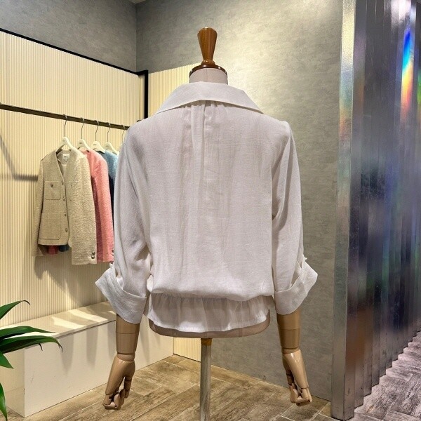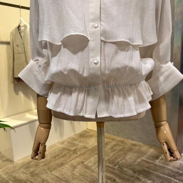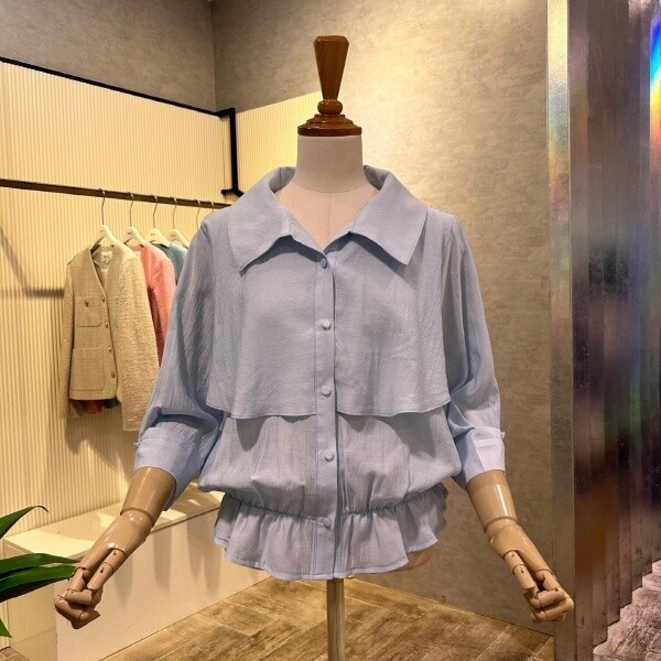 2025년 s/s?신상 밴딩 셔링 카라 언발 블라우스?입니다.세련된 디자인이 포인트 아이템 입니다.?