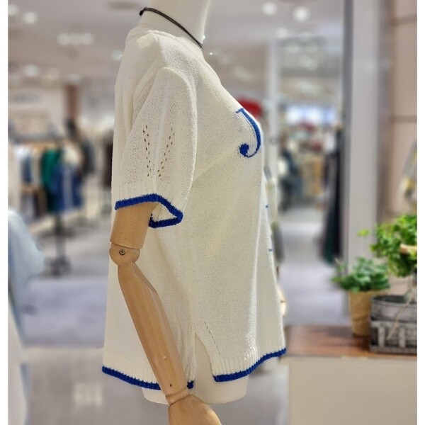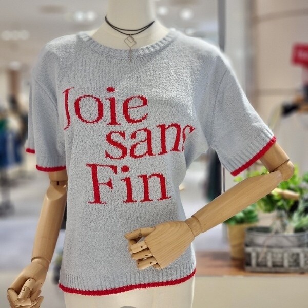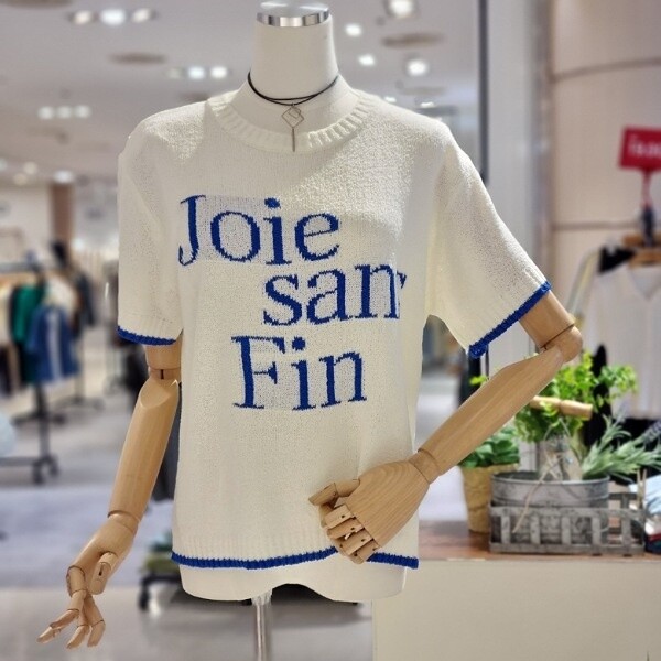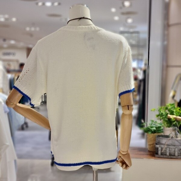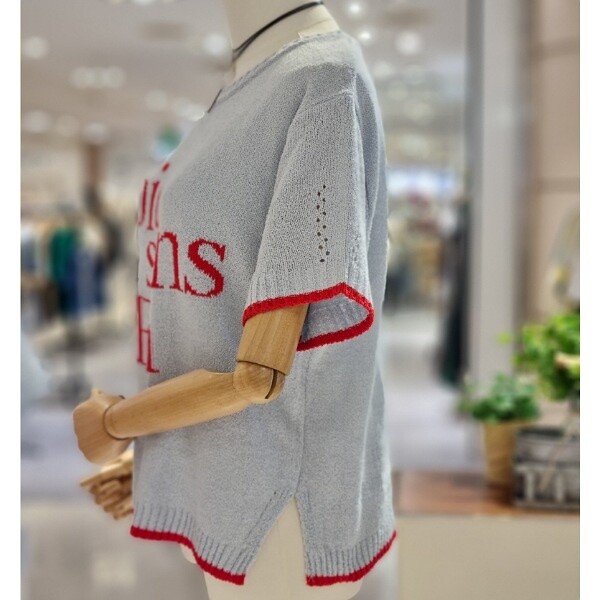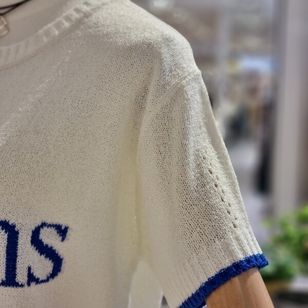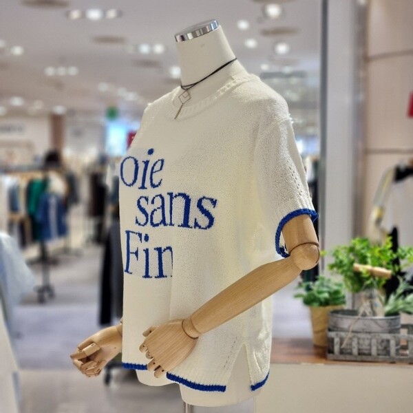 질감 있는 짜임 니트 깔끔한 레터링 디자인 시원한 소재 부분 펀칭으로 포인트를 줌