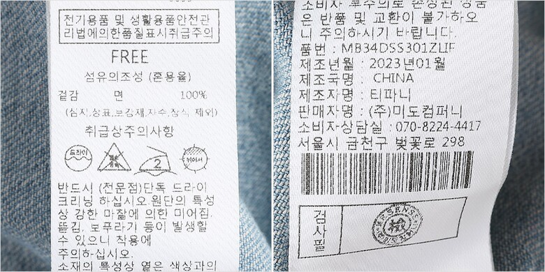 | 1. 제품 소재 (섬유의 조성 또는 혼용률을 백분율로 표시, 기능성인 경우 성적서 또는 허가서) | 겉감-면100% |