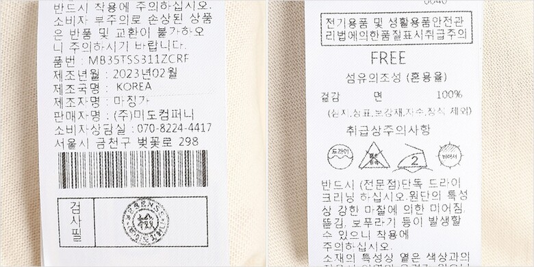 | 1. 제품 소재 (섬유의 조성 또는 혼용률을 백분율로 표시, 기능성인 경우 성적서 또는 허가서) | 겉감-면100% |