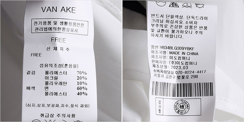| 1. 제품 소재 (섬유의 조성 또는 혼용률을 백분율로 표시, 기능성인 경우 성적서 또는 허가서) | 겉감-폴리에스터70% 폴리우레탄10% 아크릴20% 배색-폴리에스터40% 면60% |