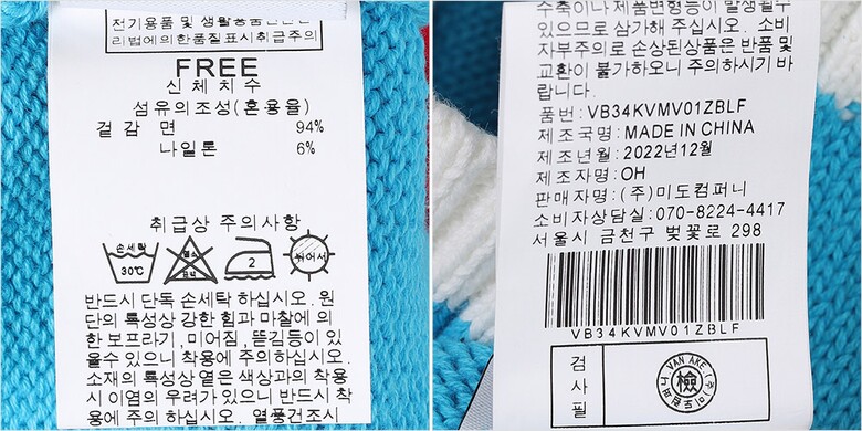 | 1. 제품 소재 (섬유의 조성 또는 혼용률을 백분율로 표시, 기능성인 경우 성적서 또는 허가서) | 겉감-면94% 나일론6% |