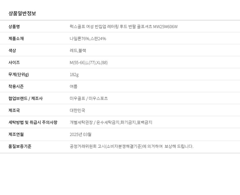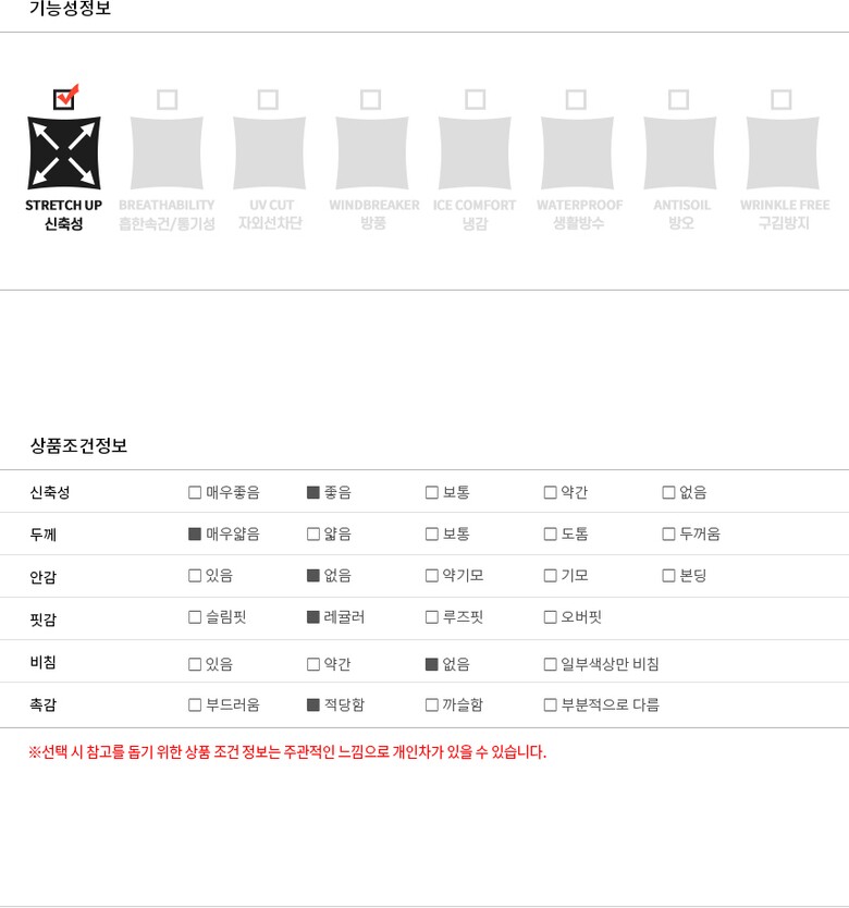 | 1. 제품 소재 (섬유의 조성 또는 혼용률을 백분율로 표시, 기능성인 경우 성적서 또는 허가서) | 상세설명참고 |