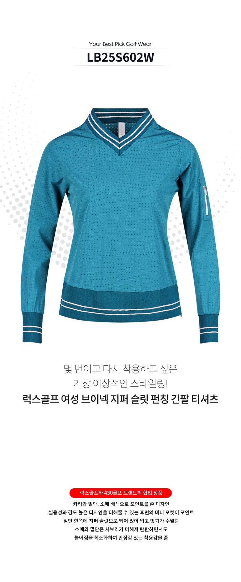 골피아 LB25S602W 여성 브이넥 지퍼 슬릿 펀칭 긴팔 티셔츠