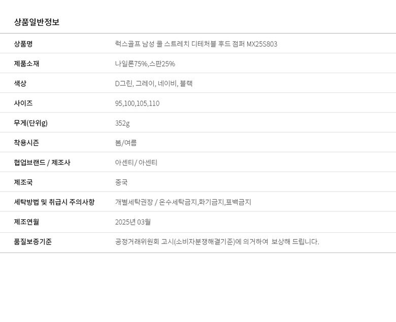 1. 제품 소재 (섬유의 조성 또는 혼용률을 백분율로 표시, 기능성인 경우 성적서 또는 허가서) 상세설명참고