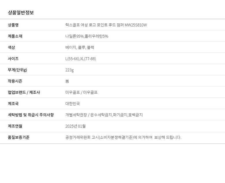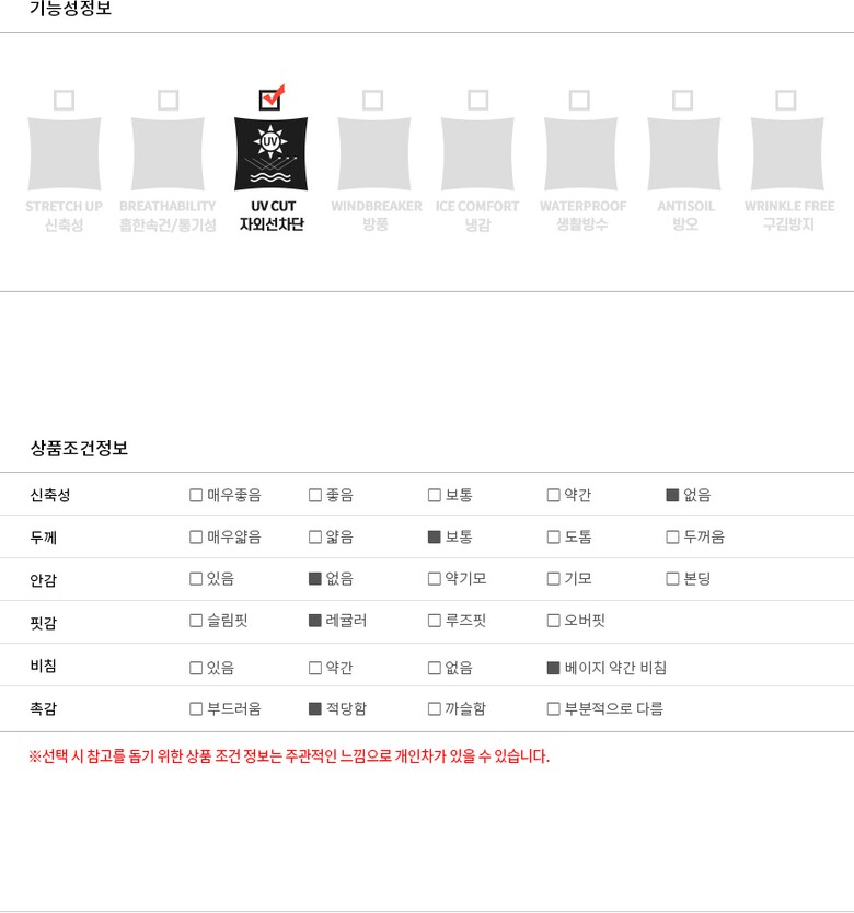| 1. 제품 소재 (섬유의 조성 또는 혼용률을 백분율로 표시, 기능성인 경우 성적서 또는 허가서) | 상세설명참고 |
