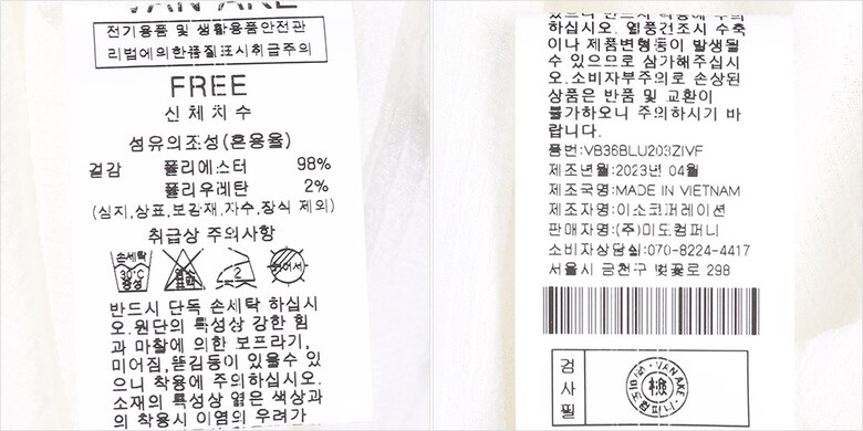 | 1. 제품 소재 (섬유의 조성 또는 혼용률을 백분율로 표시, 기능성인 경우 성적서 또는 허가서) | 겉감-폴리에스터98% 폴리우레탄2% |