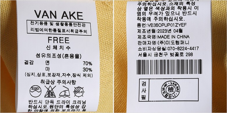 | 1. 제품 소재 (섬유의 조성 또는 혼용률을 백분율로 표시, 기능성인 경우 성적서 또는 허가서) | 겉감-면70% 마30% |