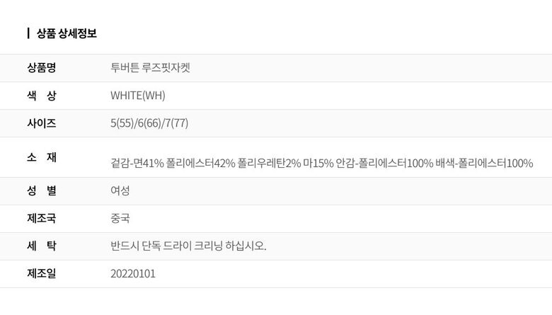 1. 제품 소재 (섬유의 조성 또는 혼용률을 백분율로 표시, 기능성인 경우 성적서 또는 허가서) 겉감-면41% 폴리에스터42% 폴리우레탄2% 마15% 안감-폴리에스터100% 배색-폴리에스터100%