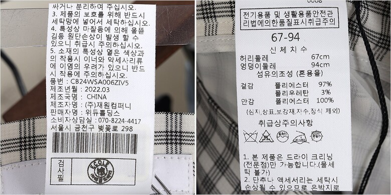 1. 제품 소재 (섬유의 조성 또는 혼용률을 백분율로 표시, 기능성인 경우 성적서 또는 허가서) 겉감-폴리에스터97% 폴리우레탄3% 안감-폴리에스터100%