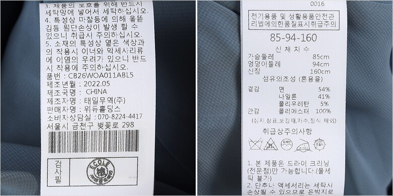 | 1. 제품 소재 (섬유의 조성 또는 혼용률을 백분율로 표시, 기능성인 경우 성적서 또는 허가서) | 겉감-면54% 폴리우레탄5% 나일론41% 안감-폴리에스터100% |