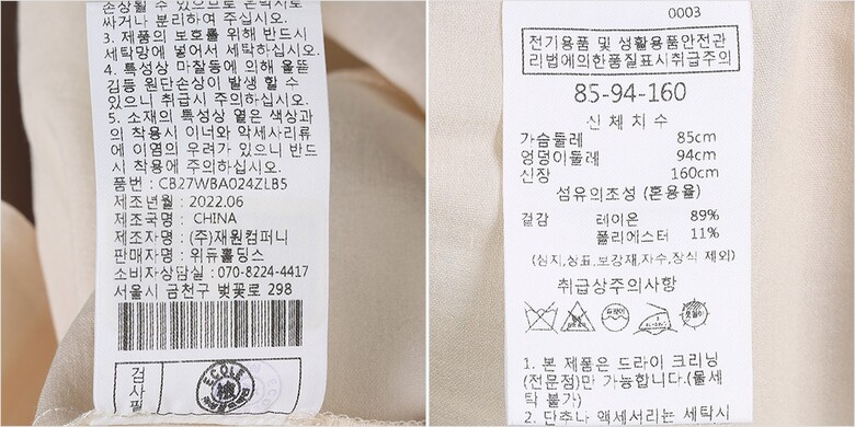 1. 제품 소재 (섬유의 조성 또는 혼용률을 백분율로 표시, 기능성인 경우 성적서 또는 허가서) 겉감-폴리에스터11% 레이온89%