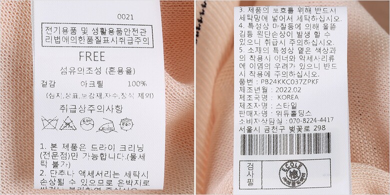 | 1. 제품 소재 (섬유의 조성 또는 혼용률을 백분율로 표시, 기능성인 경우 성적서 또는 허가서) | 겉감-아크릴100% |