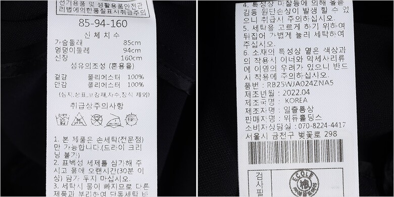 1. 제품 소재 (섬유의 조성 또는 혼용률을 백분율로 표시, 기능성인 경우 성적서 또는 허가서) 겉감-폴리에스터100% 안감-폴리에스터100%