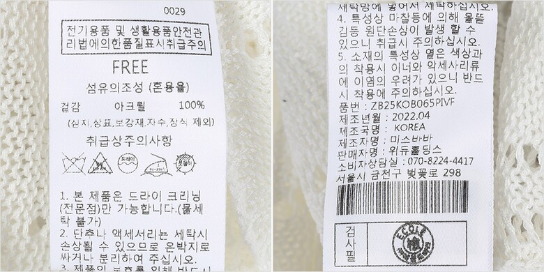 | 1. 제품 소재 (섬유의 조성 또는 혼용률을 백분율로 표시, 기능성인 경우 성적서 또는 허가서) | 겉감-아크릴100% 이너겉감-폴리에스터100% |