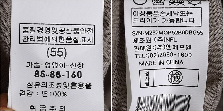 | 1. 제품 소재 (섬유의 조성 또는 혼용률을 백분율로 표시, 기능성인 경우 성적서 또는 허가서) | 겉감-면100% |
