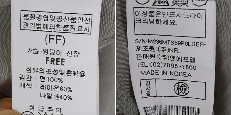 | 1. 제품 소재 (섬유의 조성 또는 혼용률을 백분율로 표시, 기능성인 경우 성적서 또는 허가서) | 겉감-면100% 배색-레이온60%나일론40% |