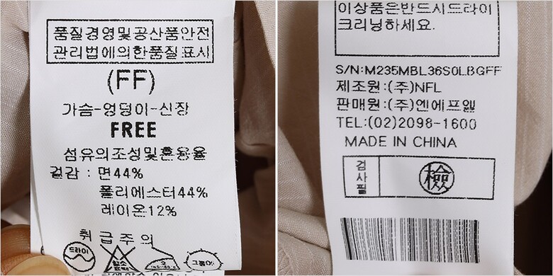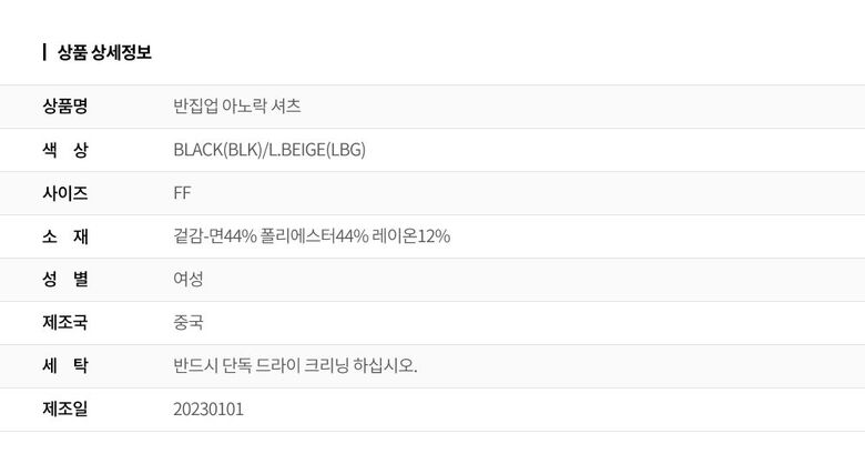 | 1. 제품 소재 (섬유의 조성 또는 혼용률을 백분율로 표시, 기능성인 경우 성적서 또는 허가서) | 겉감-면44% 폴리에스터44% 레이온12% |