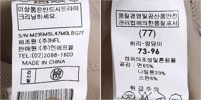 | 1. 제품 소재 (섬유의 조성 또는 혼용률을 백분율로 표시, 기능성인 경우 성적서 또는 허가서) | 겉감-면65% 나일론29% 스판6% |