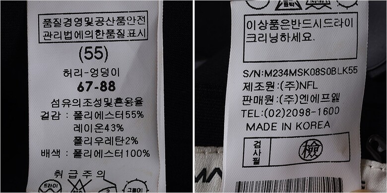 | 1. 제품 소재 (섬유의 조성 또는 혼용률을 백분율로 표시, 기능성인 경우 성적서 또는 허가서) | 겉감-폴리에스터55% 폴리우레탄2% 레이온43% 배색-폴리에스터100% |