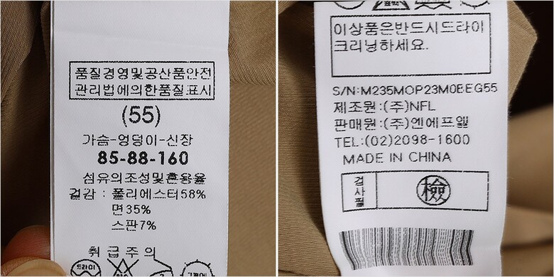 | 1. 제품 소재 (섬유의 조성 또는 혼용률을 백분율로 표시, 기능성인 경우 성적서 또는 허가서) | 겉감-면35% 폴리에스터58% 스판7% |