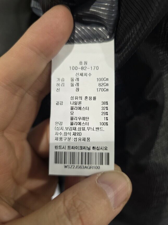 겉감 : 나이론 38% , 폴리에스터 32% , 모 29% , 폴리우레탄 1%