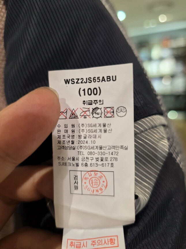 | 1. 제품 소재 (섬유의 조성 또는 혼용률을 백분율로 표시, 기능성인 경우 성적서 또는 허가서) | 겉감 : 폴리에스터 80% , 마 18% , 폴리우레탄 2% 안감 : 폴리에스터 |
