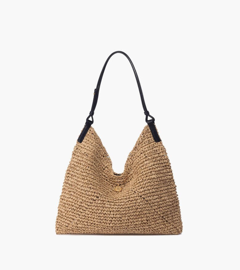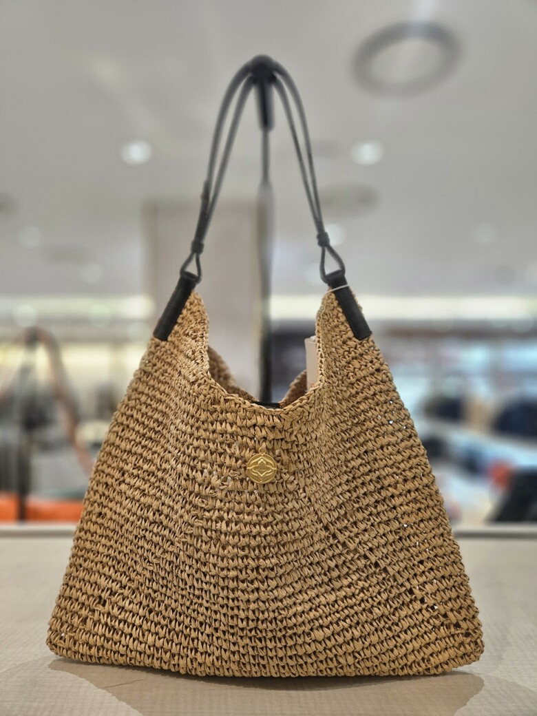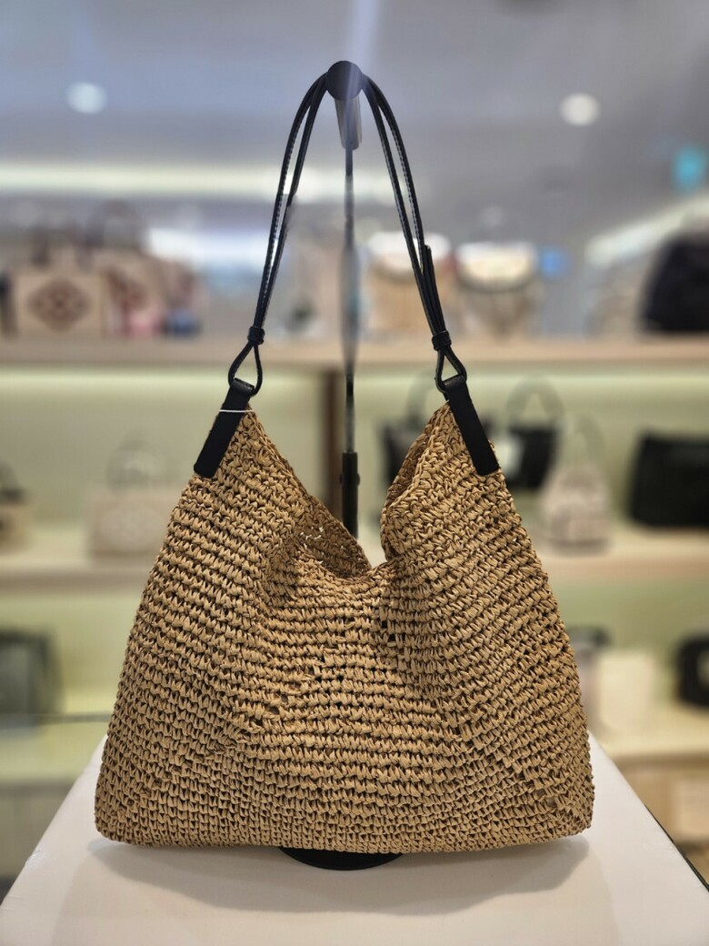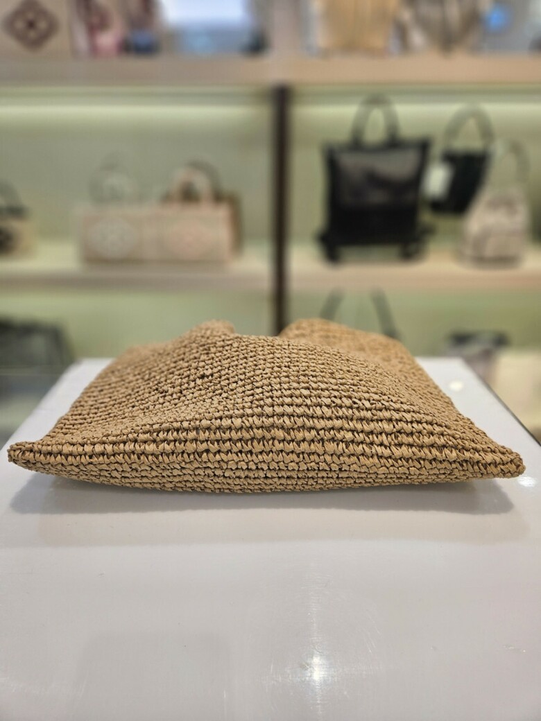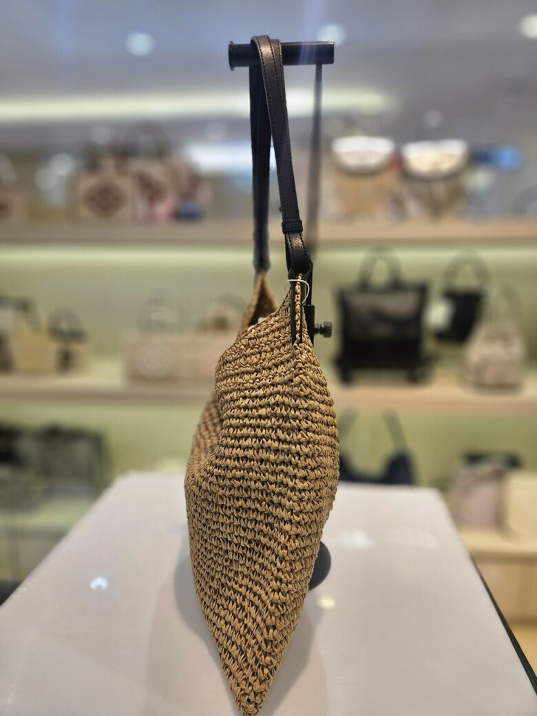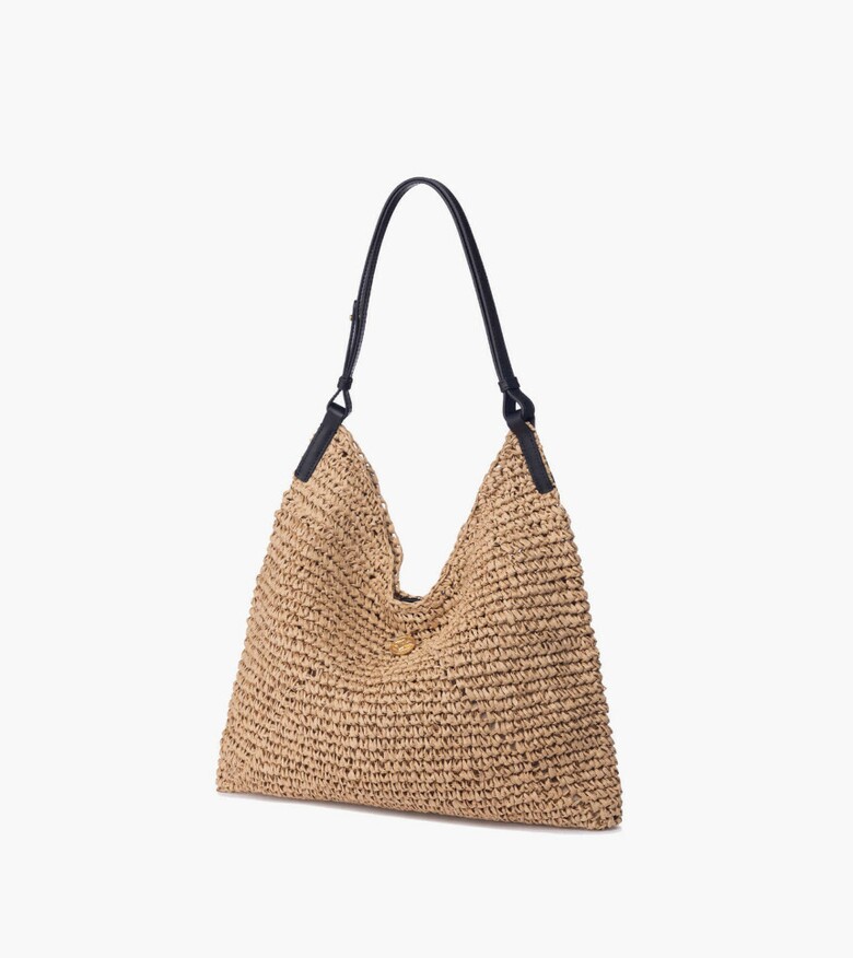 삼각 모양으로 자연스럽게 쳐지는 쉐입이 멋스러운 라피아 숄더백입니다.