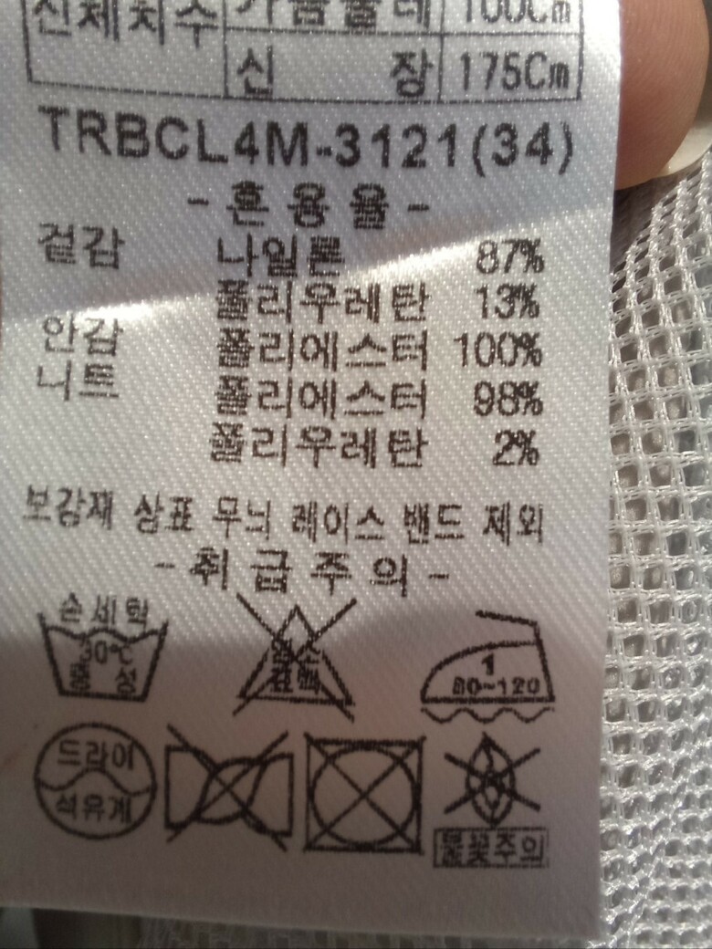 | 1. 제품 소재 (섬유의 조성 또는 혼용률을 백분율로 표시, 기능성인 경우 성적서 또는 허가서) | 겉감:나일론 87%, 폴리우레탄 13% / 안감:폴리에스테르 98%, 니트 98 |