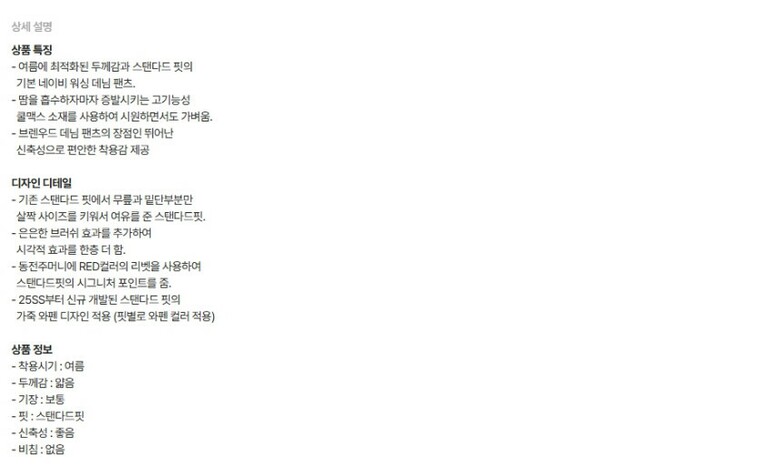 | 1. 제품 소재 (섬유의 조성 또는 혼용률을 백분율로 표시, 기능성인 경우 성적서 또는 허가서) | 상품상세참조 |