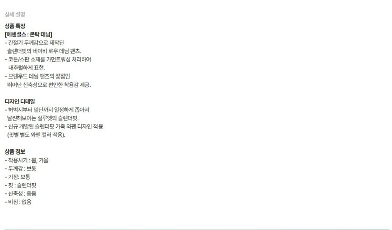| 1. 제품 소재 (섬유의 조성 또는 혼용률을 백분율로 표시, 기능성인 경우 성적서 또는 허가서) | 상품상세참조 |