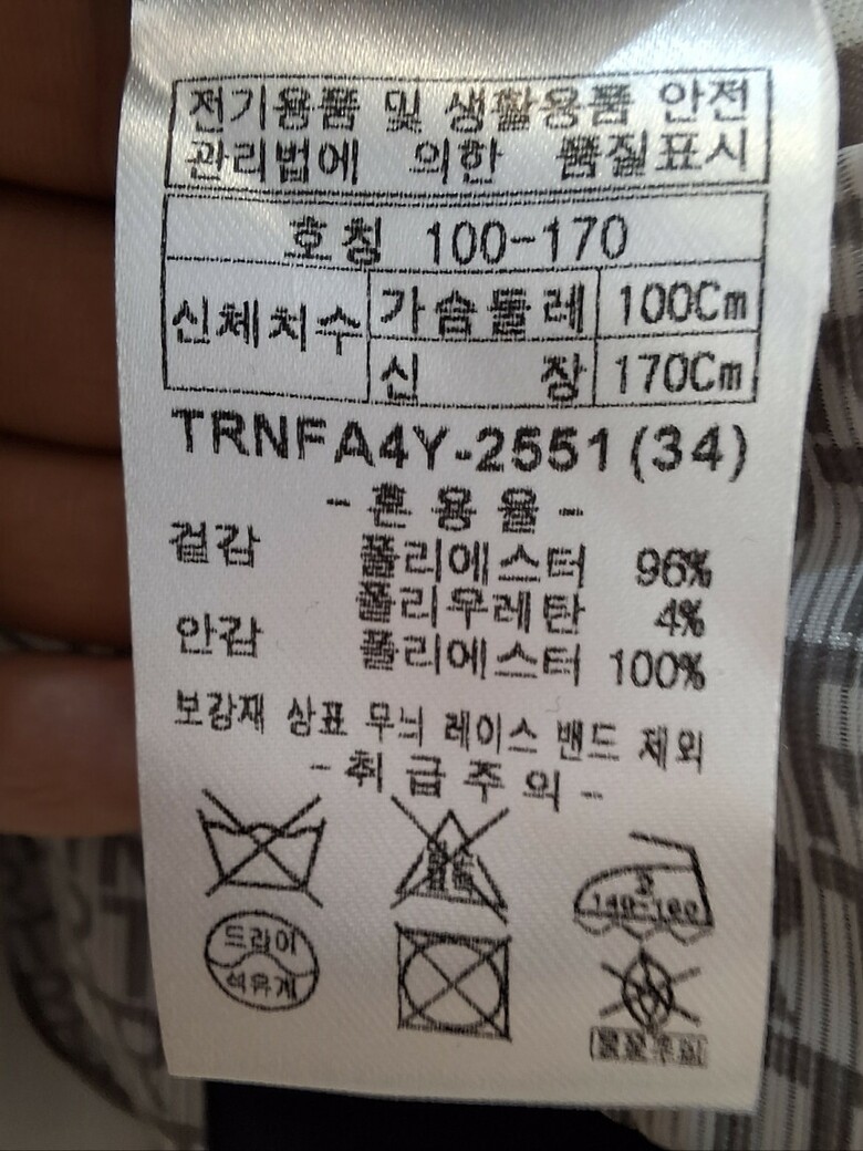 | 1. 제품 소재 (섬유의 조성 또는 혼용률을 백분율로 표시, 기능성인 경우 성적서 또는 허가서) | 겉감:폴리에스테르 96%, 폴리우레탄 / 안감:폴리에스테르 100%, 레이 |