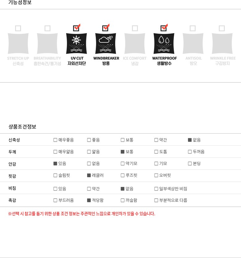 | 6. 세탁방법 및 취급시 주의사항 | 개별세탁권장/온수세탁금지,화기금지,표백금지 |