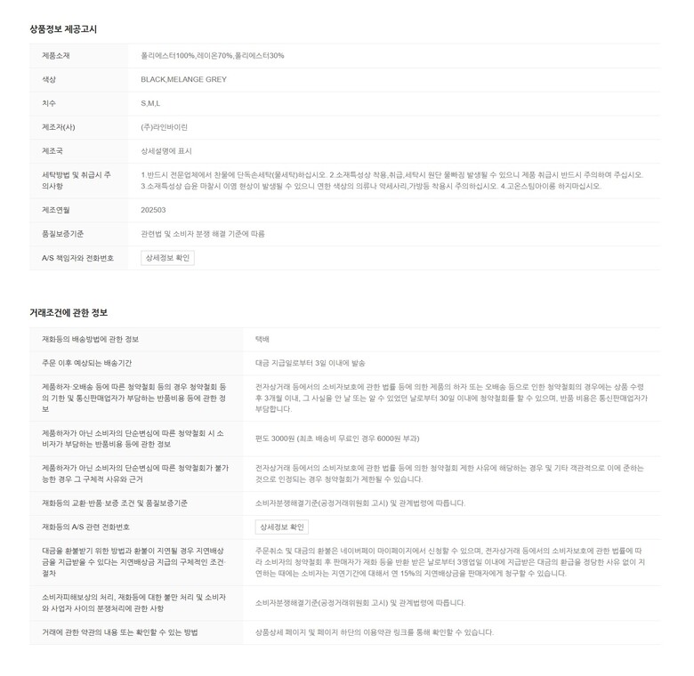 | 6. 세탁방법 및 취급시 주의사항 | 상품상세참조 |