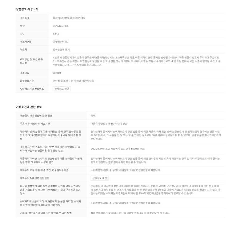 | 6. 세탁방법 및 취급시 주의사항 | 상품상세참조 |