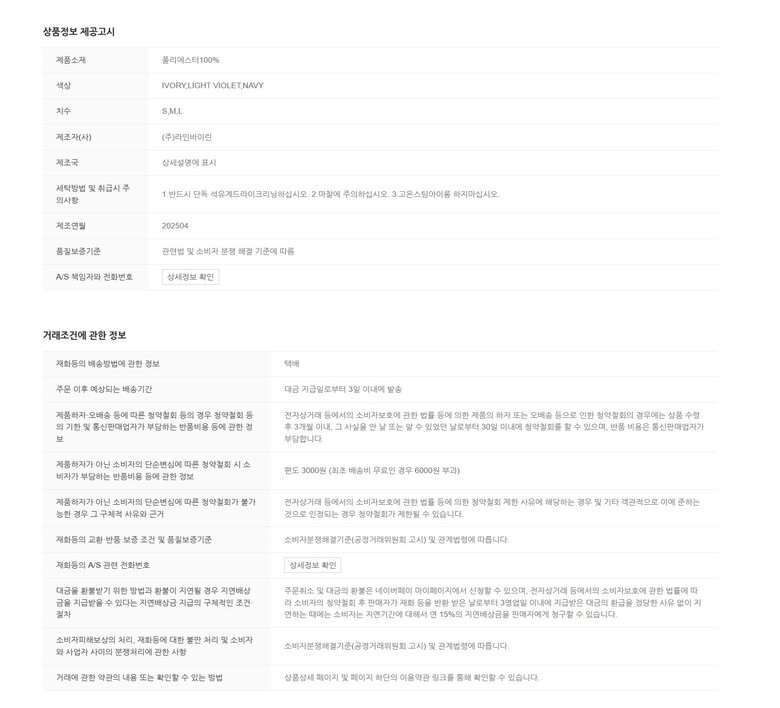 | 6. 세탁방법 및 취급시 주의사항 | 상품상세참조 |