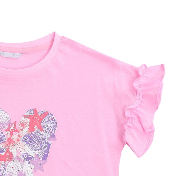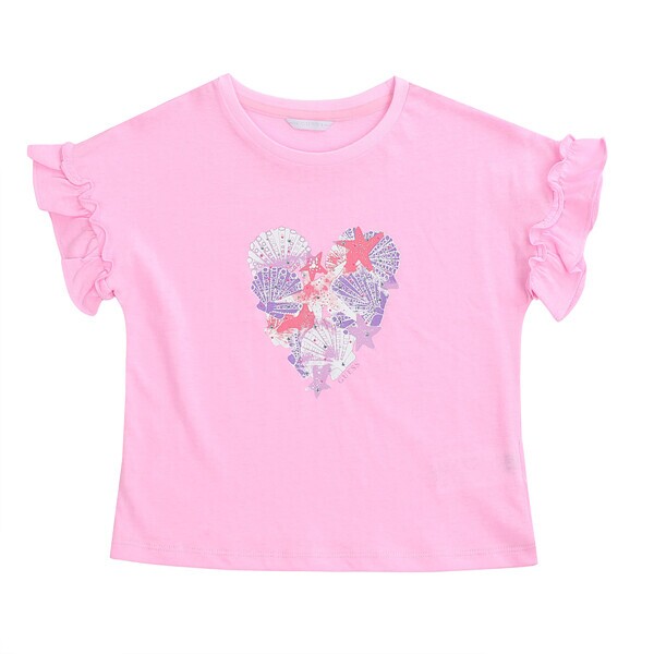 - 형광핑크 조개하트 나염 여아용 티셔츠입니다