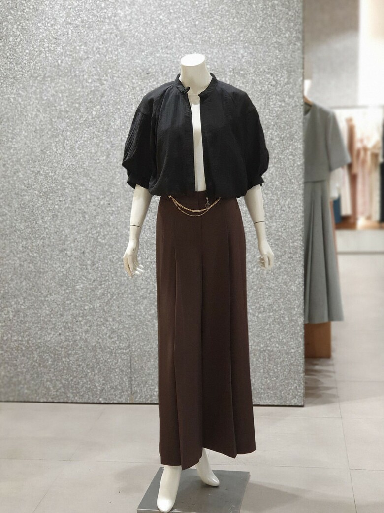 체인 장식과 프런트 더블 핀턱 디테일이 입체감을 살려주어