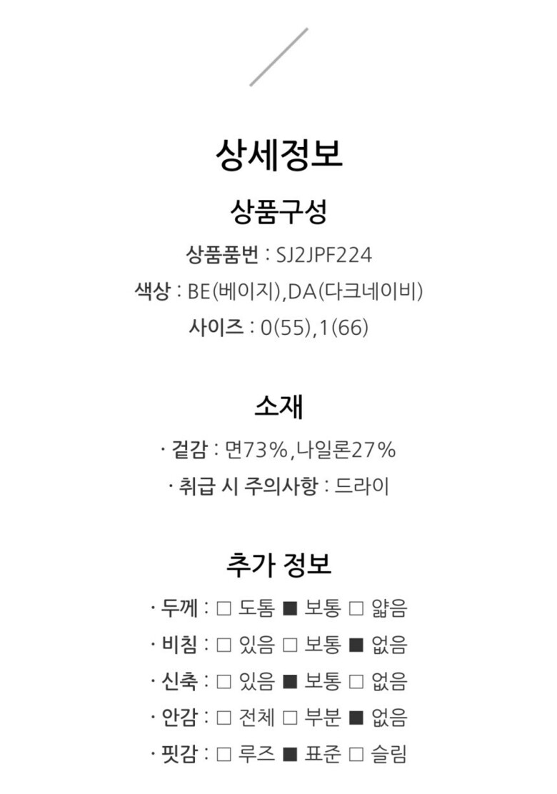 | 1. 제품 소재 (섬유의 조성 또는 혼용률을 백분율로 표시, 기능성인 경우 성적서 또는 허가서) | 상품상세참조 |